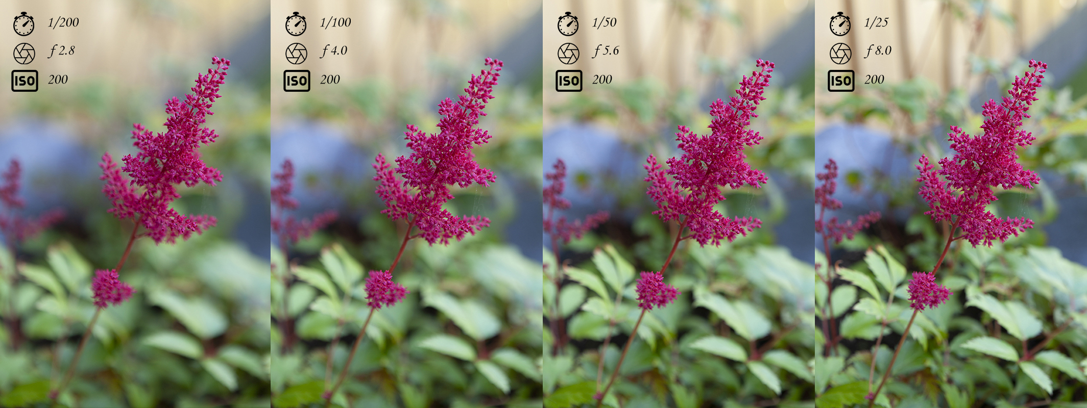 In de 4 foto’s zie je ook weer de relatie tussen diafragma, sluitertijd en ISO terugkeren. De foto’s zijn exact hetzelfde belicht, maar door het veranderende diafragma moet de sluitertijd aangepast worden om dezelfde belichting te krijgen. één f-getal hoger betekent een verdubbeling van de sluitertijd, als de ISO-waarde gelijk blijft.